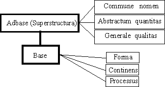 Based on Latin language, we will consider an abstract graph of basis-superstructure (Fig. 1.2). Nature, as the complex of objective basis-superstructure (base-adbase or base-superstructura), induces in human consciousness a triad of the basis: form (forma), contents (contienes), process (processus); and a triad of the superstructure: a common name of an object of thought (commune nomen), abstract quantity (abstractum quantitas), and quality of relatively common character (generale qualitas).
