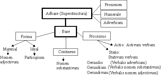 At the level of the basis, a material form is expressed by the factor set nomen adiectivum (adjective) and an ideal form is presented by the characteristic set participium (participle).