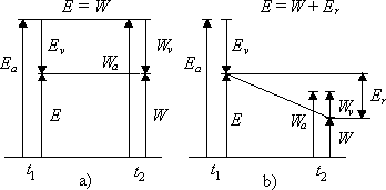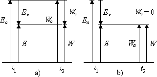 Рис.2.1 Диаграммы закона сохранения при а) абсолютно-упругом ударе и b) абсолютно-неупругом ударе; Ea , Wa - абсолютная энергии, Ev и Wv - относительные энергии и E и W - полная абсолютно-относительная энергии до и после обмена.
