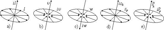 Бесконечное множество потенциальных радиальных лучей к прямой линии движения характеризует поле потенциально-кинетического прямолинейного движения (рис.2.5а). Это поле продольно-поперечное. Аналогична структура поля скорости и ускорений (рис.2.5b,c). Такова же структура векторов состояния, импульса (рис.2.5d,e):